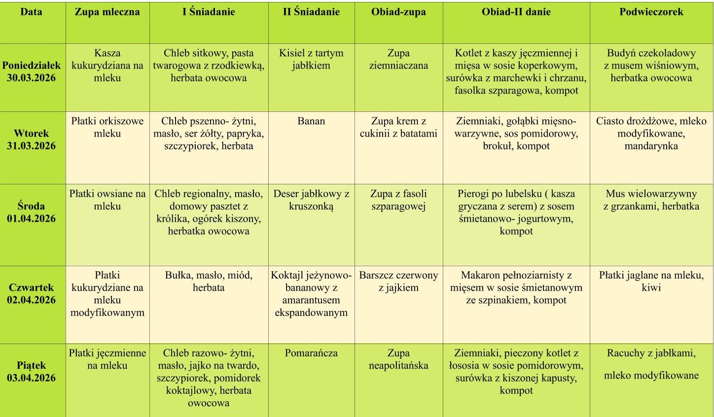 Dla dzieci wymagających diet eliminacyjnych jadłospis jest odpowiednio modyfikowany.